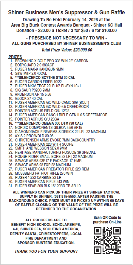 Shiner Area Big Buck Contest sponsored by the Shiner Businessmen's Club